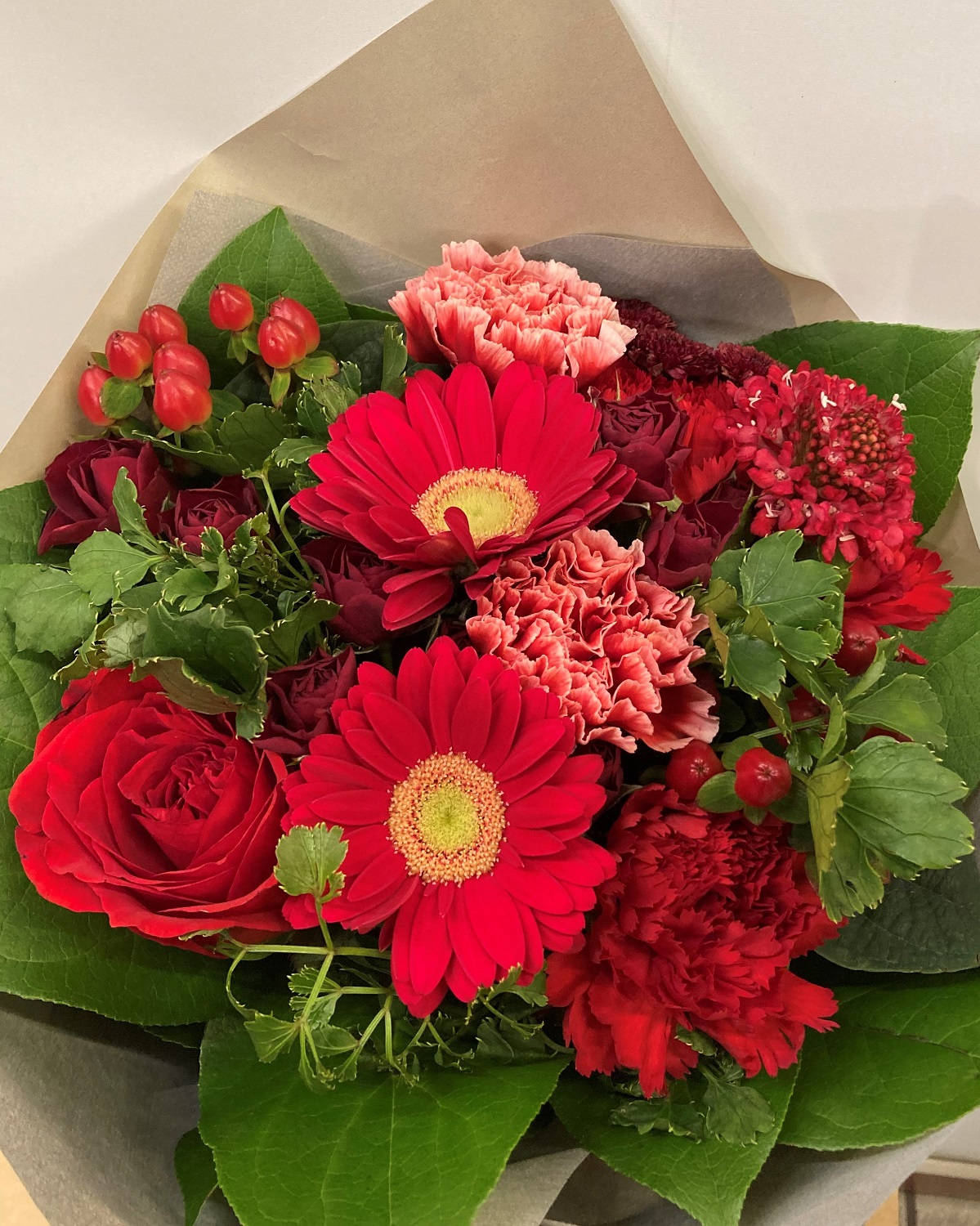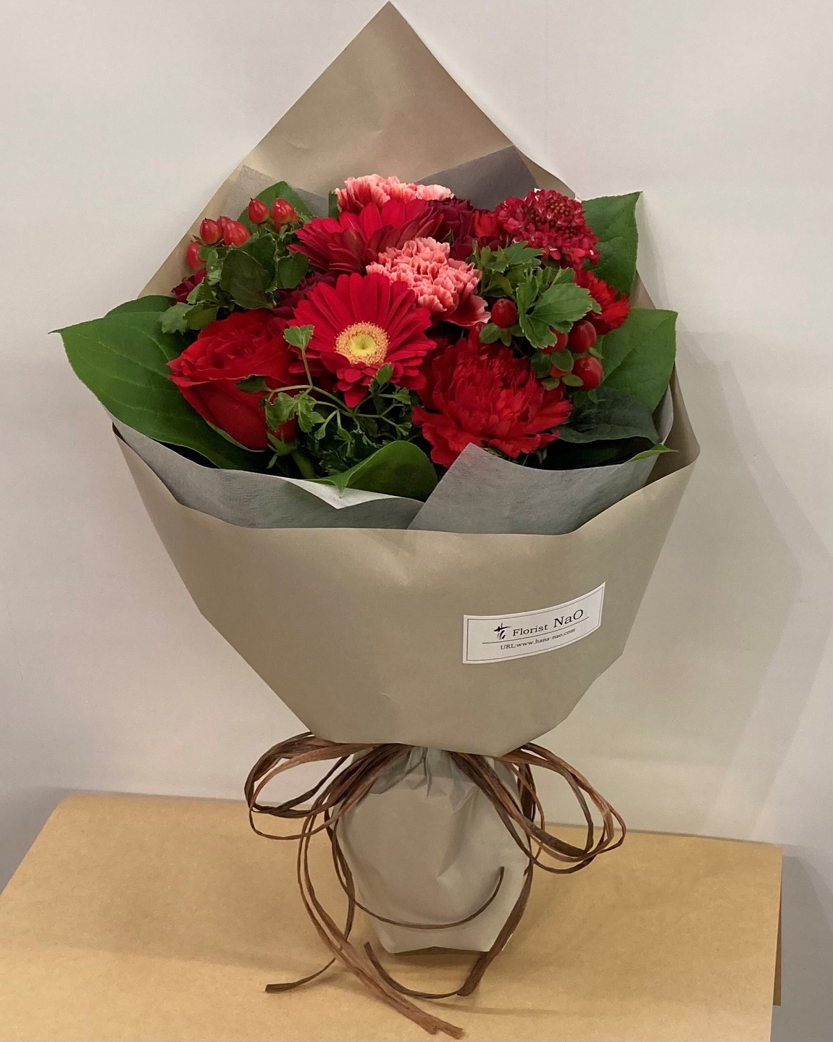 スタンダード赤系花束 (bouquet15) 販売価格(税込)¥3,850在庫状態 : 在庫有り■ サイズ(約):高さ45×幅25cm ■ コメント:一般的なワンサイドの花束 ■ 品番:花束15 ★横浜市中区西区南区への配達に限ります。 ★原則前日17時までの申し込みとなります。 ★お届け日当日の申し込みは、ご注文の前にお電話にてお問い合わせください。 配達状況を確認します。TEL:045-641-3057 ※季節・仕入れ状況により花材や資材が異なることがありますご了承ください。 ※天候・受注状況によりご注文を受けられない場合があります。 数量