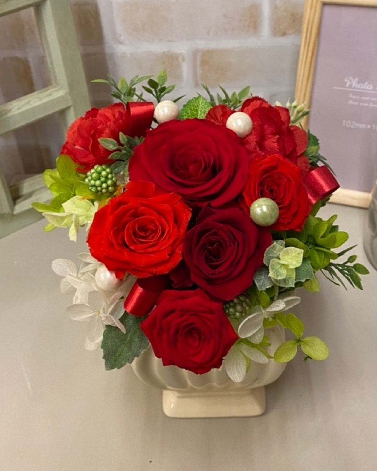 ■ コメント:中~大輪の薔薇を使用した華やかなプリザーブドフラワー