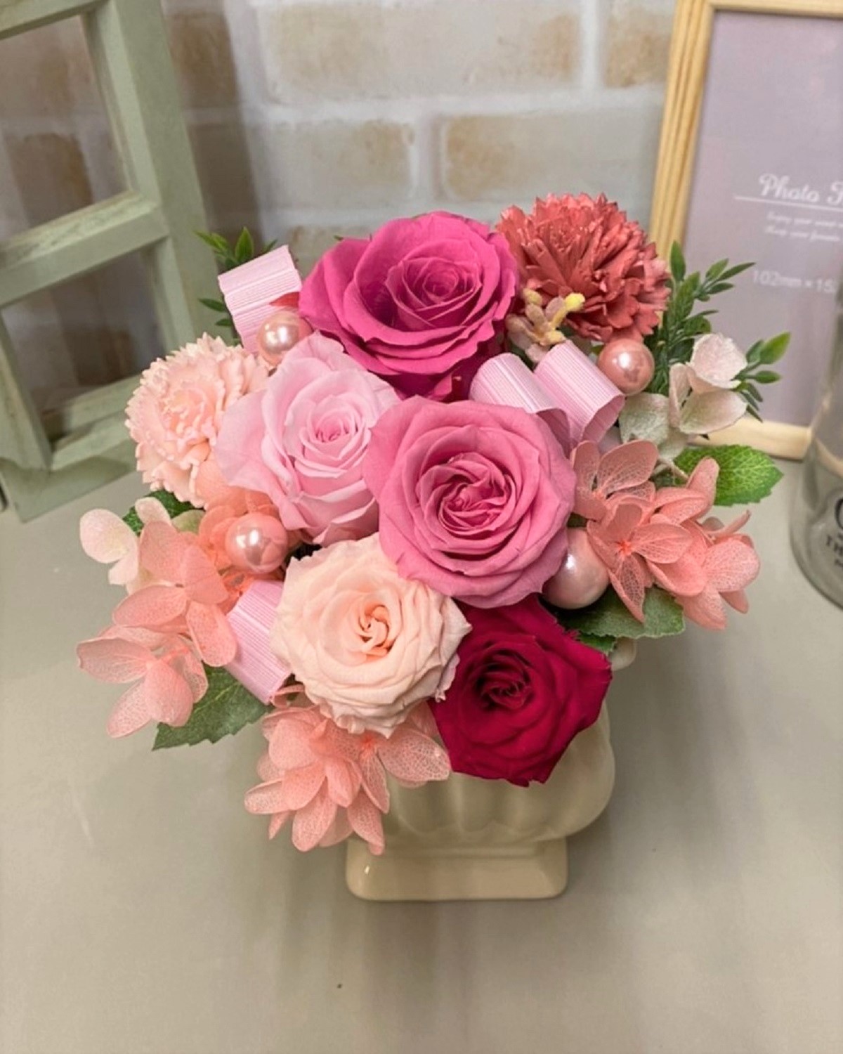 ■ コメント:中~大輪の薔薇を使用した華やかなプリザーブドフラワー