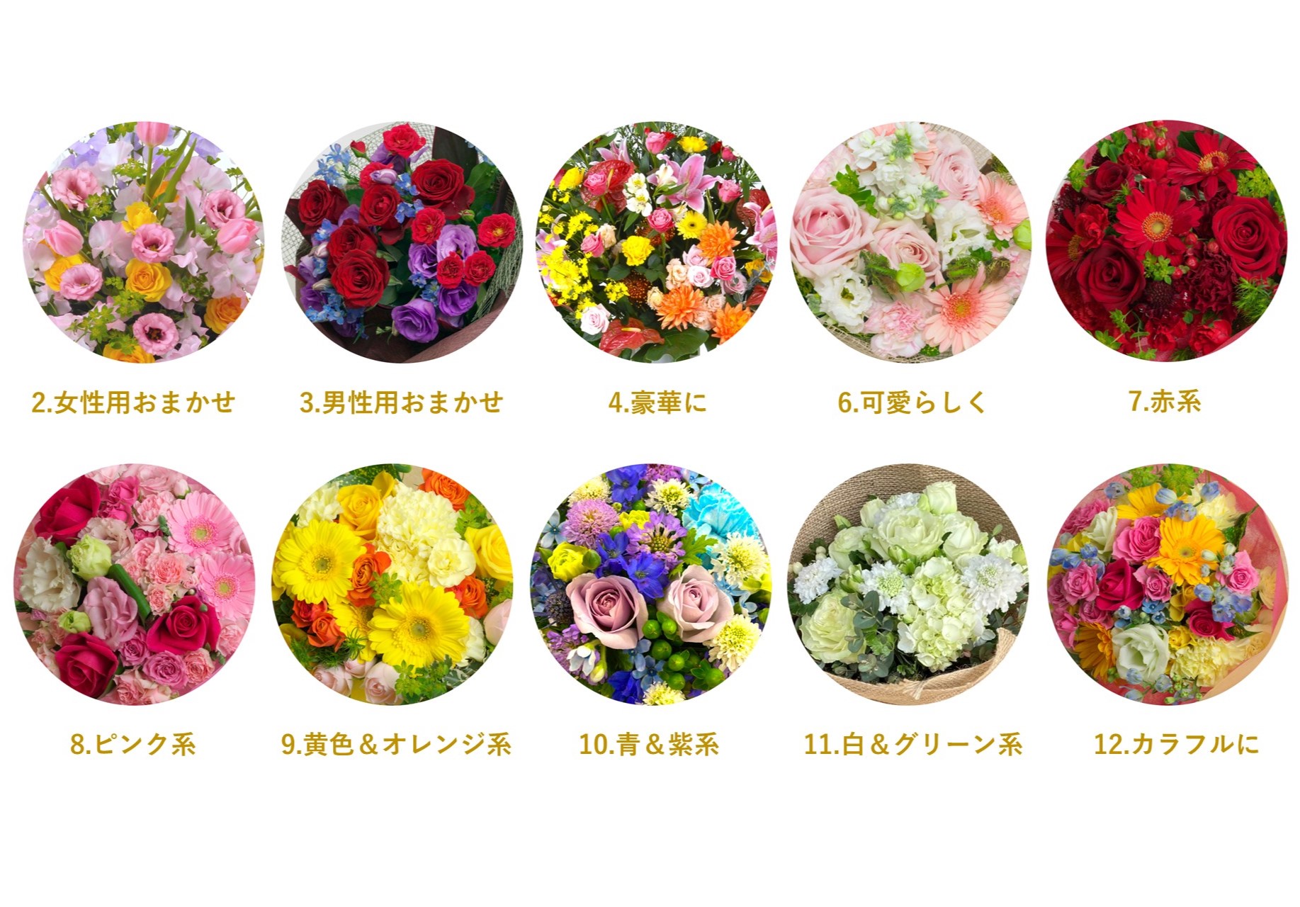 1.プロにおまかせ 2.女性用おまかせ 3.男性用おまかせ 4.豪華に 5.季節の花で 6.可愛らしく