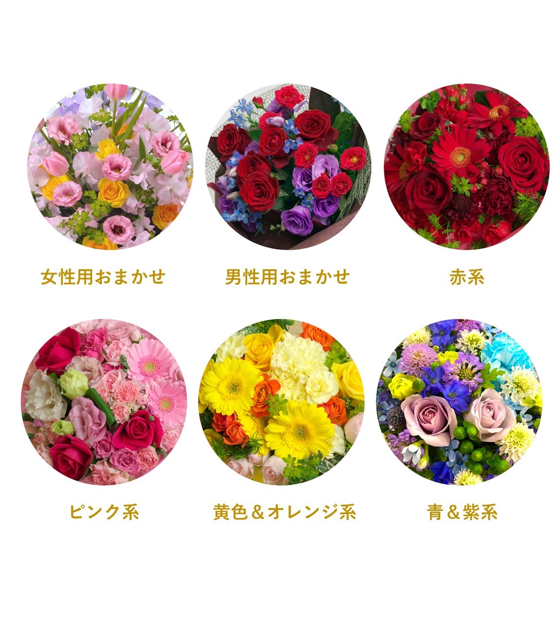 1.女性用おまかせ 2.男性用おまかせ 3.赤系 4.ピンク系 5.黄&オレンジ系 6.青&紫系