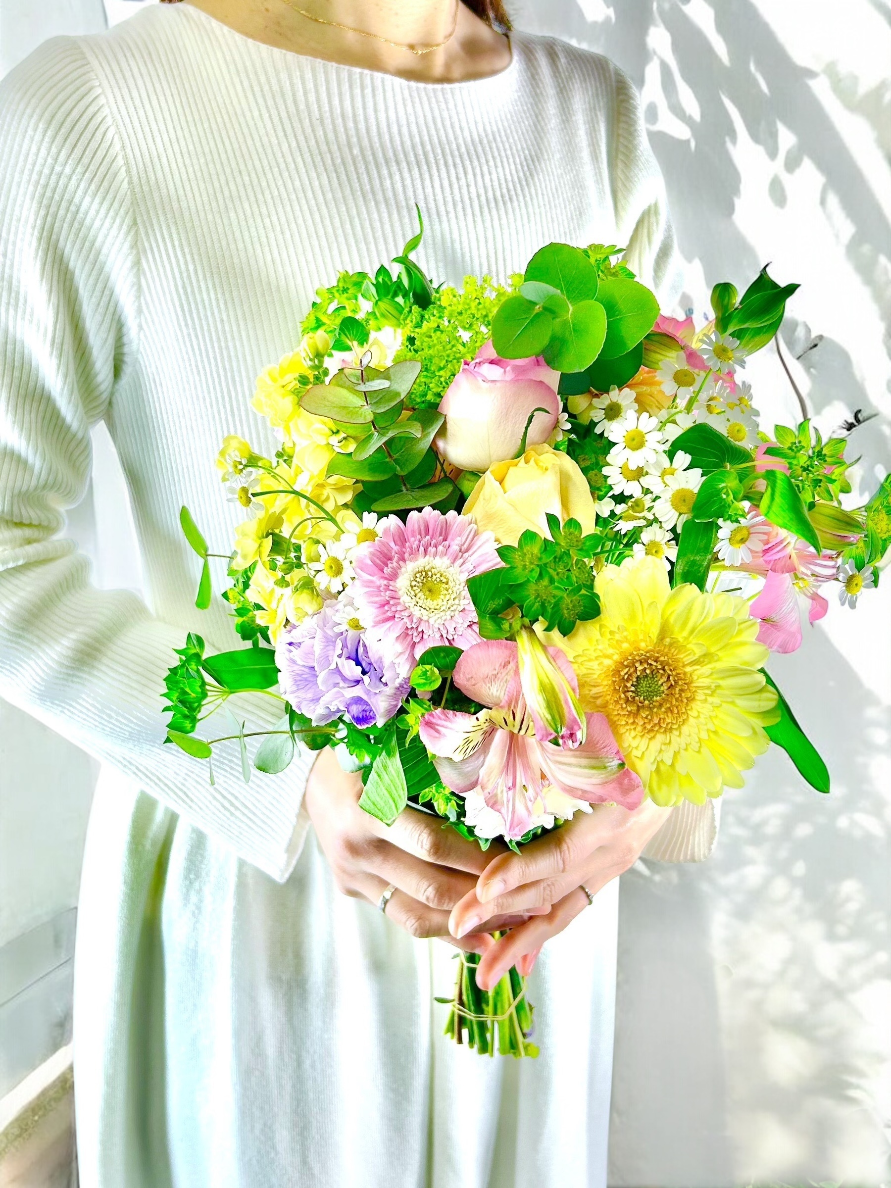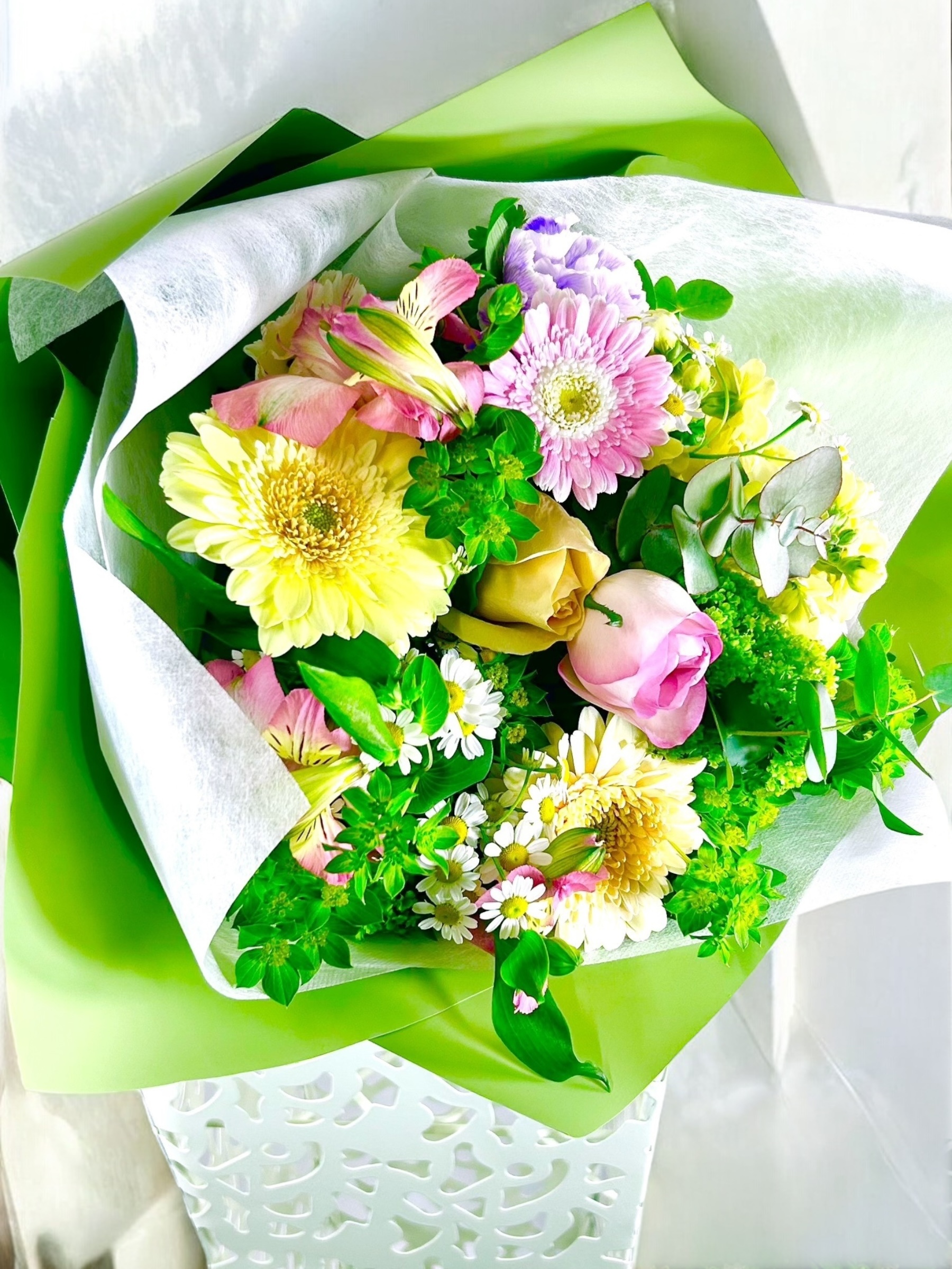 レギュラーパステル系ブーケ (bouquet114) 販売価格(税込)¥5,500在庫状態 : 在庫有りサイズ(約):高さ40×幅35cm ■ コメント:ボリュームがある素敵なブーケ花束 ■ 品番:花束114 ★横浜市中区西区南区への配達に限ります。 ★原則前日17時までの申し込みとなります。 ★お届け日当日の申し込みは、ご注文の前にお電話にてお問い合わせください。 配達状況を確認します。TEL:045-641-3057 ※季節・仕入れ状況により花材や資材が異なることがありますご了承ください。 ※天候・受注状況によりご注文を受けられない場合があります。 数量