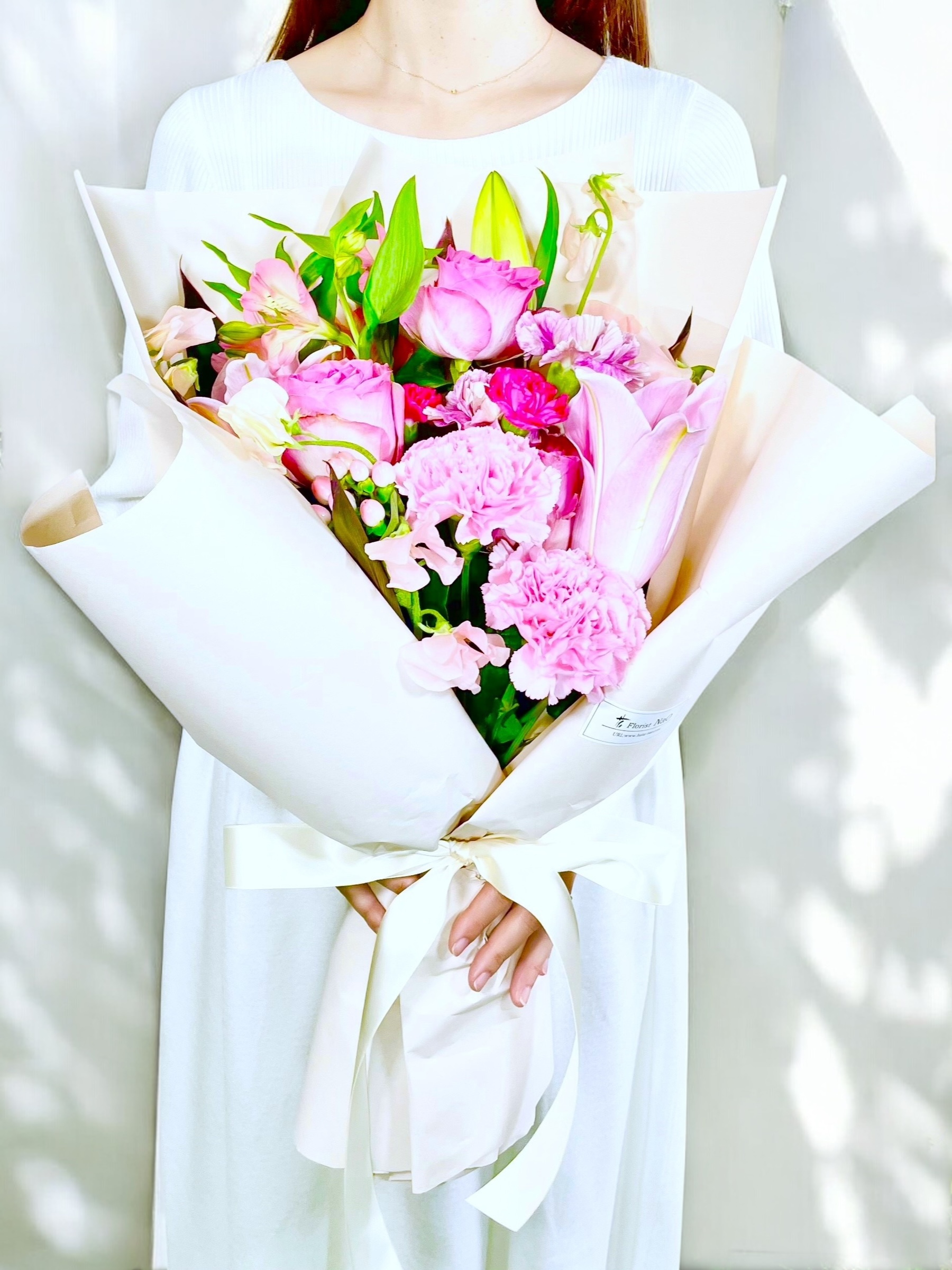 レギュラーピンク系花束 (bouquet121) 販売価格(税込)¥5,500在庫状態 : 在庫有り■ サイズ(約):高さ50×幅35cm ■ コメント:ボリュームもある、素敵なワンサイド花束。 ■ 品番:花束121 ★横浜市中区西区南区への配達に限ります。 ★原則前日17時までの申し込みとなります。 ★お届け日当日の申し込みは、ご注文の前にお電話にてお問い合わせください。 配達状況を確認します。TEL:045-641-3057 ※季節・仕入れ状況により花材や資材が異なることがありますご了承ください。 ※天候・受注状況によりご注文を受けられない場合があります。 数量