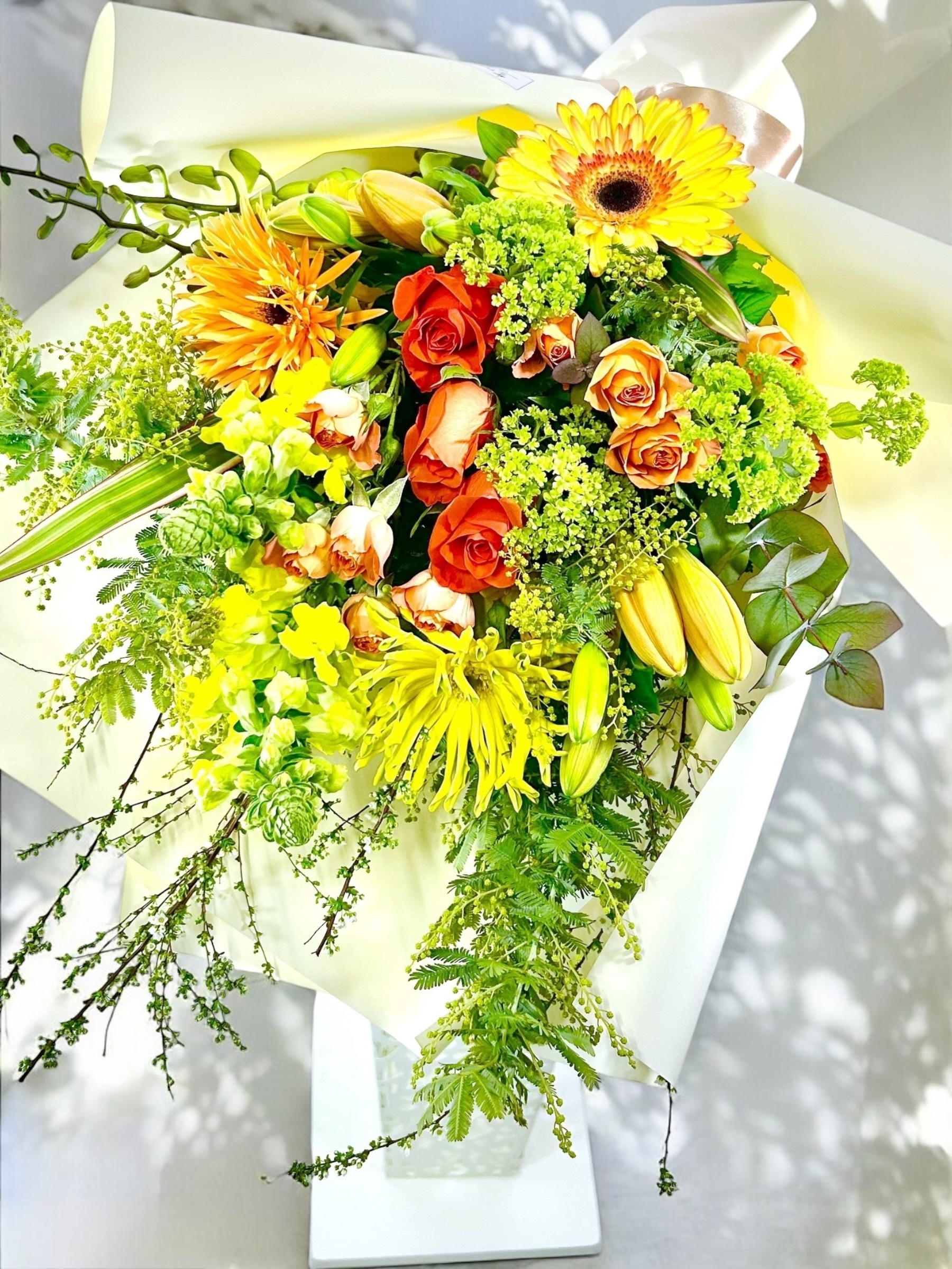 スタイリッシュ黄色オレンジ系花束 (bouquet152) 販売価格(税込)¥11,000在庫状態 : 在庫有り■ サイズ(約):高さ70×幅45cm ■ コメント:スタイリッシュな丈長めの花束。 ■ 品番:花束152 ★横浜市中区西区南区への配達に限ります。 ★原則前日17時までの申し込みとなります。 ★お届け日当日の申し込みは、ご注文の前にお電話にてお問い合わせください。 配達状況を確認します。TEL:045-641-3057 ※季節・仕入れ状況により花材や資材が異なることがありますご了承ください。 ※天候・受注状況によりご注文を受けられない場合があります。 数量