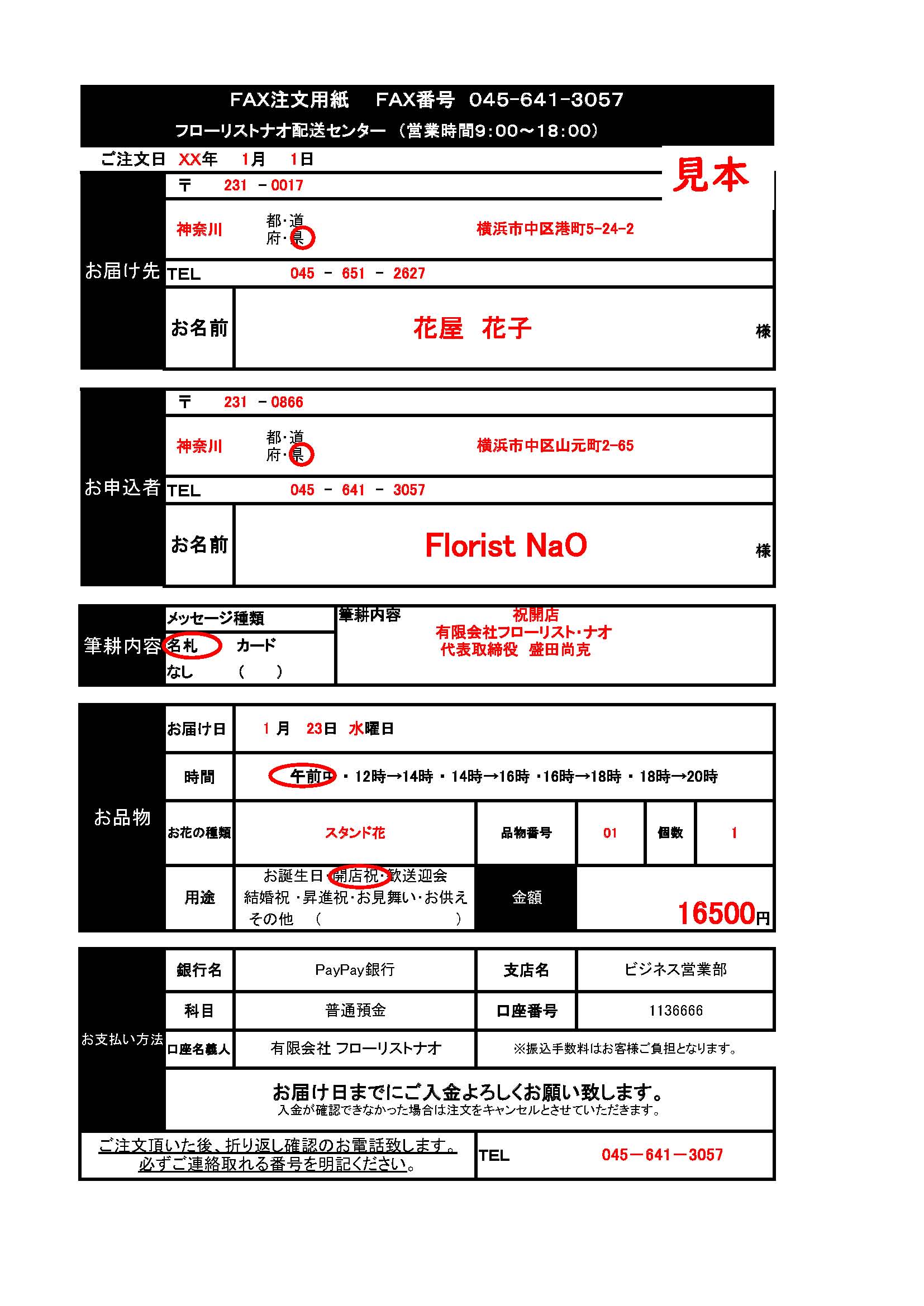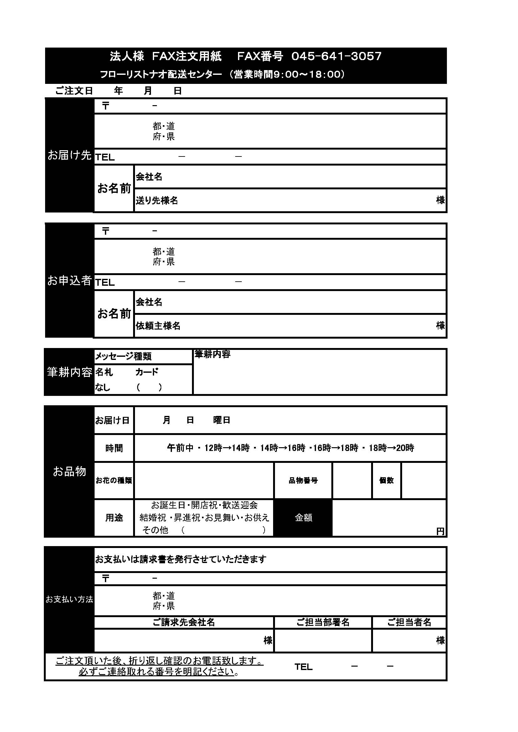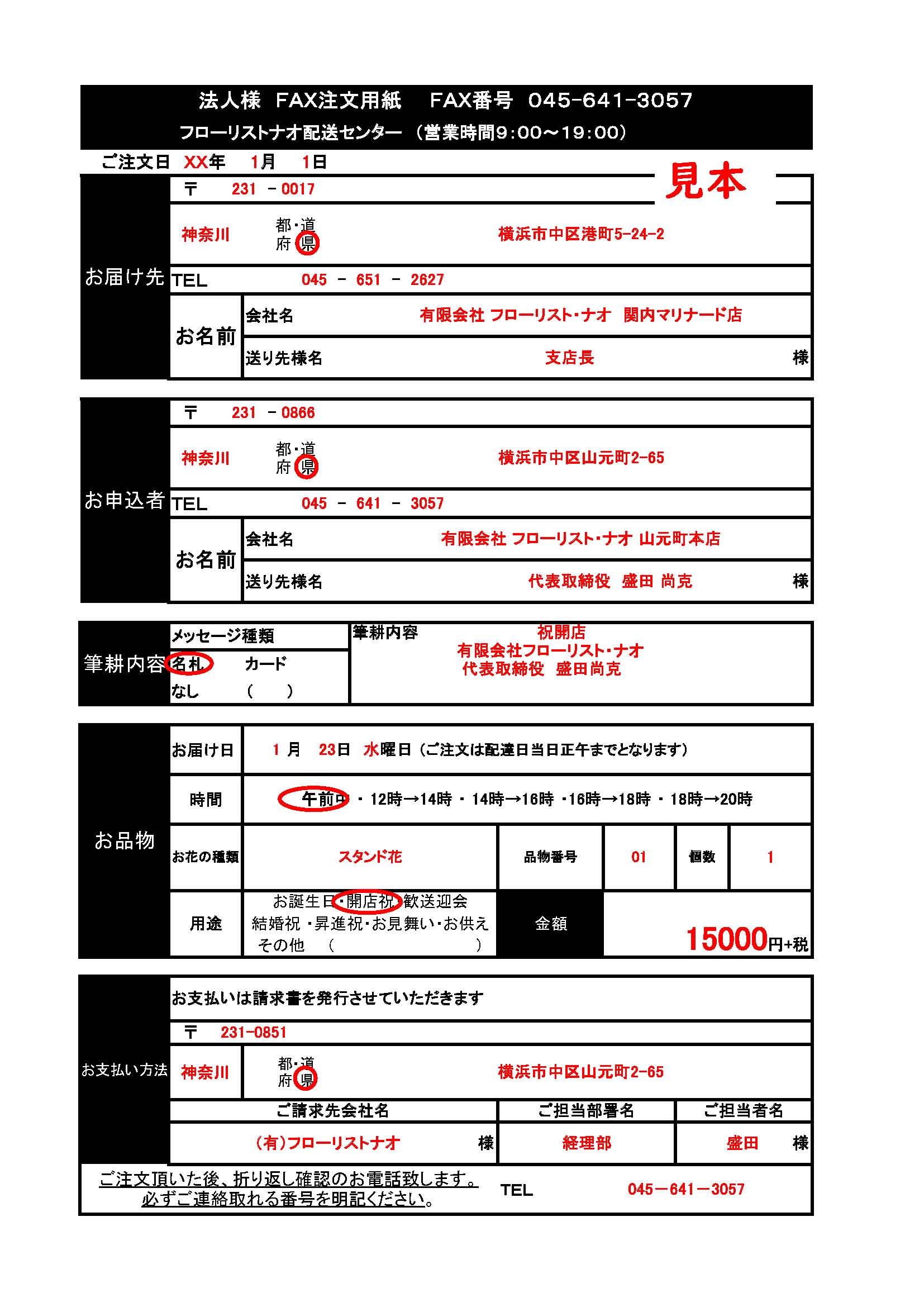 - 法人様用FAX:ご注文用紙&記入見本