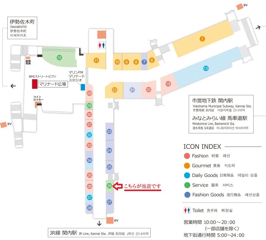 | 関内マリナード店 | 所在地:〒231-0017 神奈川県横浜市中区港町5-24-2 マリナード地下街 ※ JR関内駅北口より地下街入り口を降りていただくとすぐにあります TEL&FAX:045-651-2627 営業時間:平日・土日・祝日 10:00 ~ 19:00 年末年始:1月1日~3日休み |